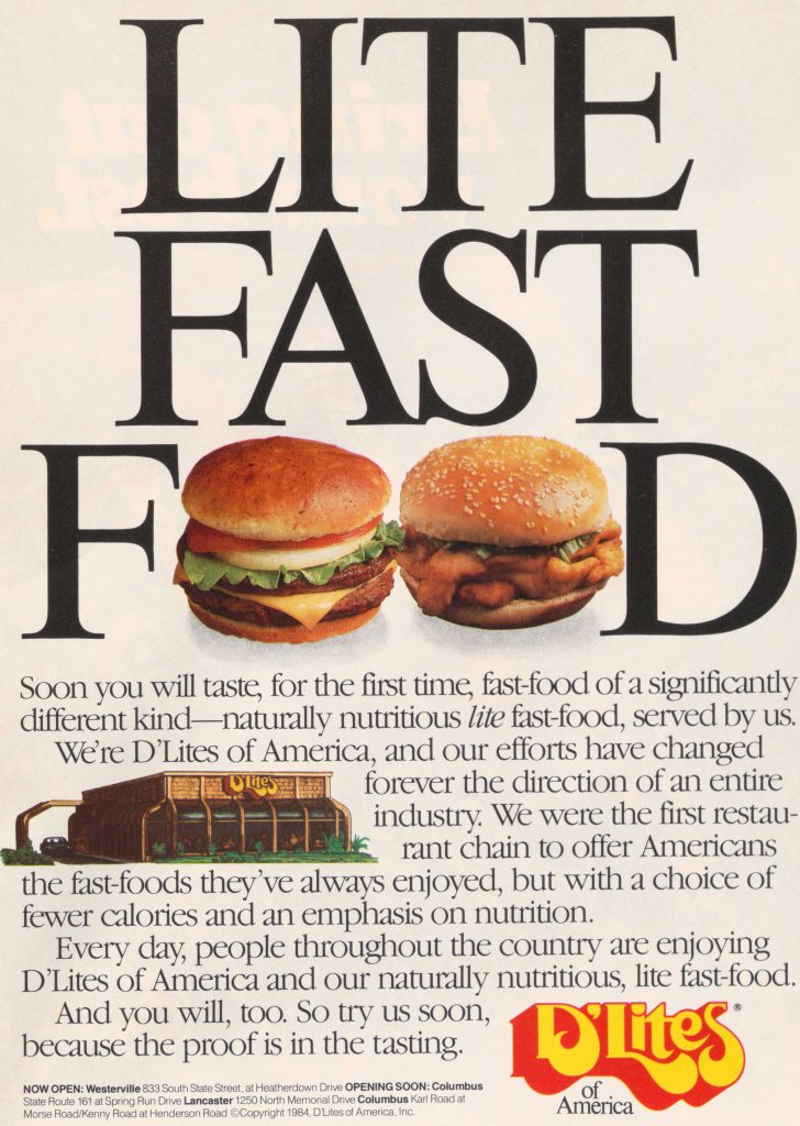D’lites D’Lites of America was a fast food chain was known for serving fast food with a higher emphasis on nutrition. It featured reduced-calorie dishes, including hamburgers made with lean beef, high-fiber buns, and low-calorie cheese. February 14, 2026 saturn500f